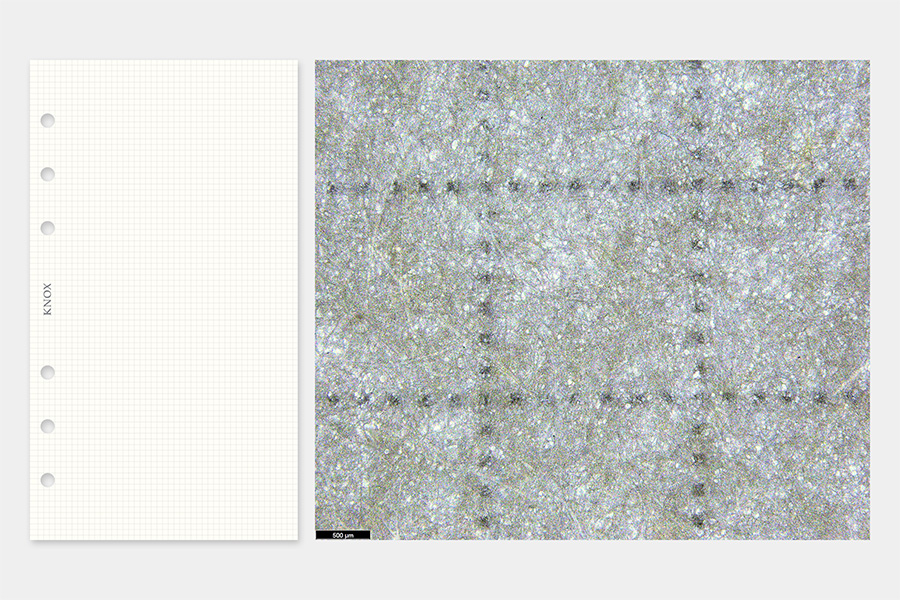 「ノックス」には「メモ2mm方眼」と「メモ5mm方眼」の2種類の方眼リフィルがある(ミニ5サイズは「メモ5mm方眼」のみ)。共通する大きな魅力は、罫線が限りなく控えめに設計されていることだ。いかに「控えめ」なのか。各方眼罫の交差部を顕微鏡で拡大してみた(下写真左はバイブルサイズのリフィル全体。右が拡大したもの)。